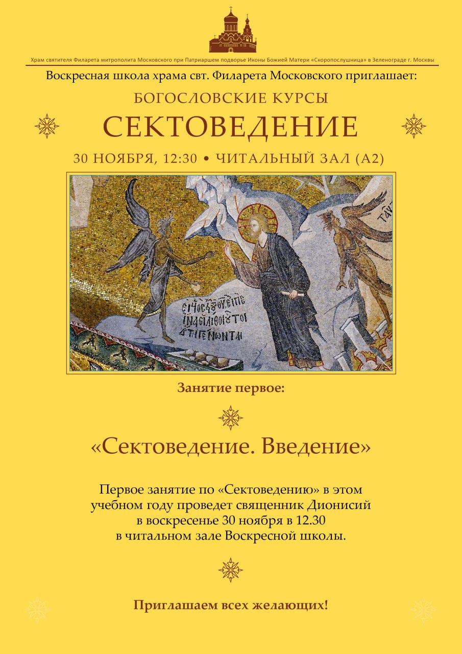 Первое занятие по "Сектоведению" в этом учебном году проведет священник Дионисий в воскресенье 30 ноября в 12.30 в читальном зале Воскресной школы. Тема занятия: "Сектоведение. Введение".