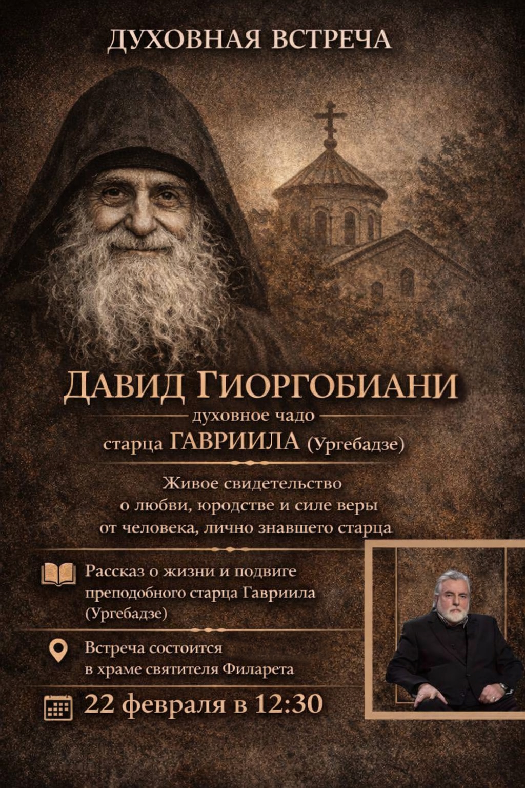 В воскресенье 22 февраля в 12.30 в Воскресной школе храма святителя Филарета состоится духовная встреча с Давидом Гиоргобиане — духовным чадом преподобного старца Гавриила (Ургебадзе).