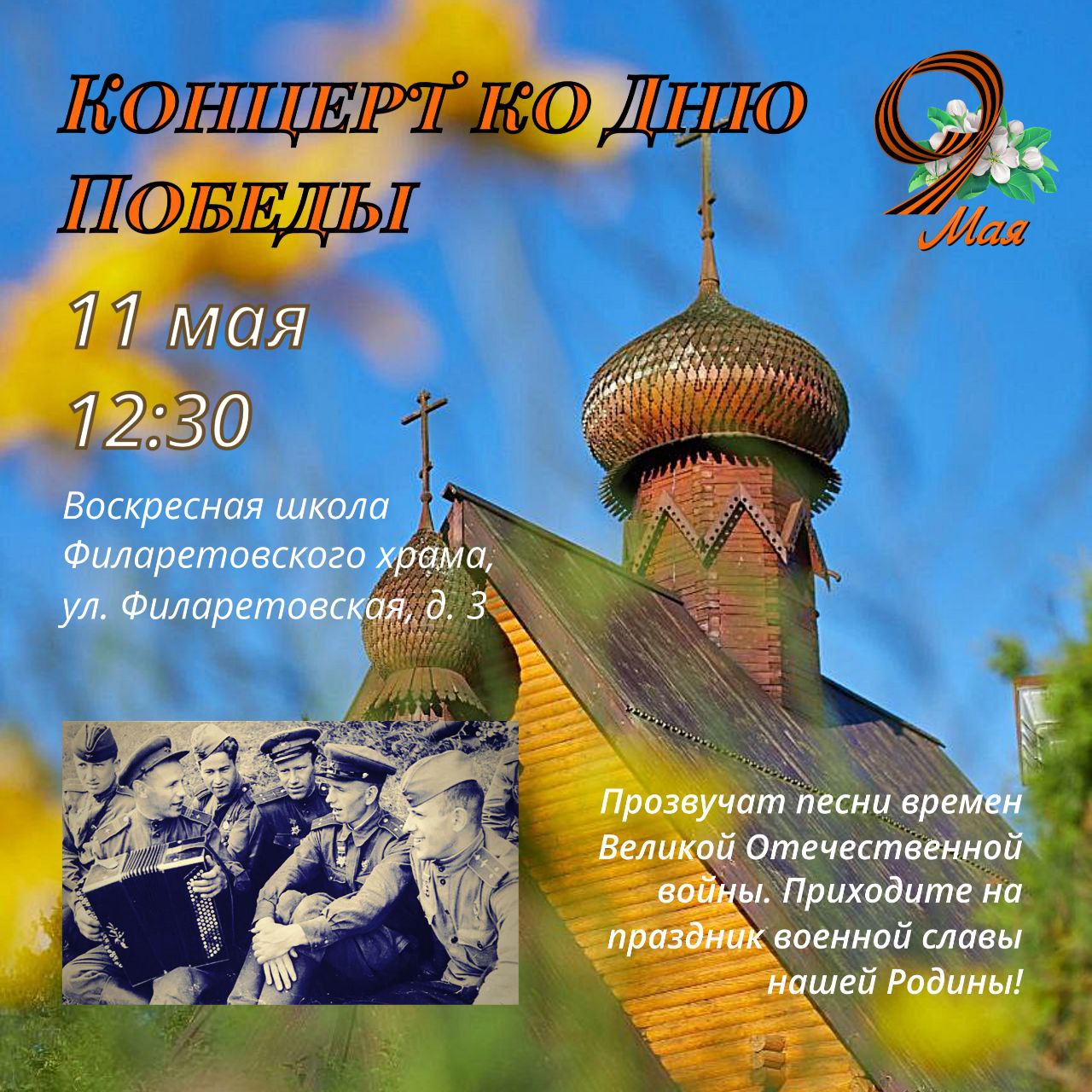 11 мая в 12:30 в читальном зале Воскресной школы храма святителя Филарета пройдёт концерт, посвящённый Дню Победы в Великой Отечественной войне.