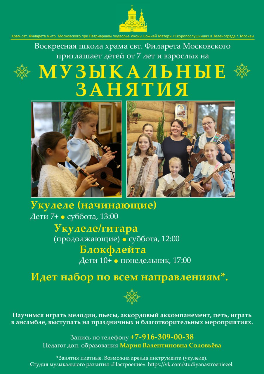 Воскресная школа храма свт. Филарета Московского в Зеленограде приглашает детей от 7 лет и взрослых на занятия по игре на музыкальных инструментах.